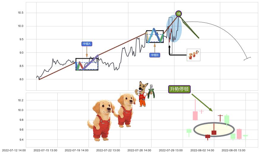 ➣ 【中枢B】:07-14:14-07-27:14,中枢由5笔构成,共19交易小时, ZG=9.68, ZD=9.41