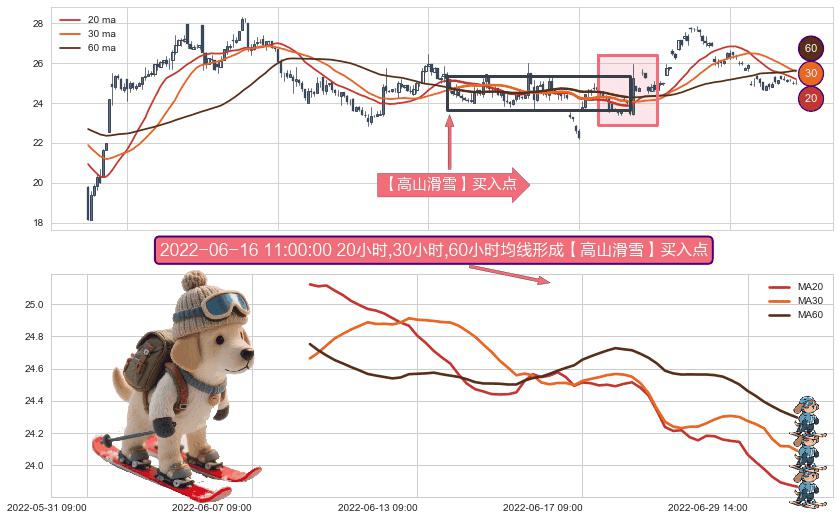 ⚀ 2022-06-08 11:00:00小时-2022-07-04 14:00:00小时显现 20小时-30小时-60小时均线 【高山滑雪】买入点 看多信号,后市看涨,买入