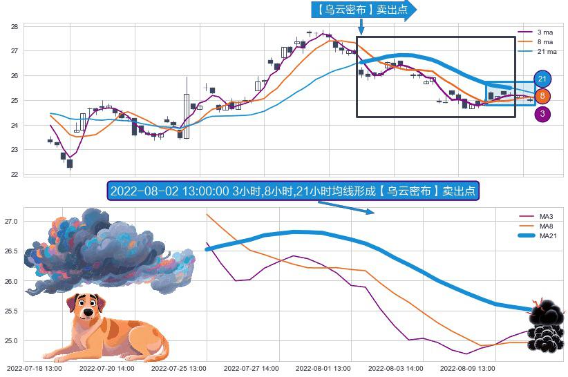 ⚀ 2022-07-25 13:00:00小时-2022-08-10 14:00:00小时显现 3小时-8小时-21小时均线 【乌云密布】卖出点 看空信号,后市看跌,卖出