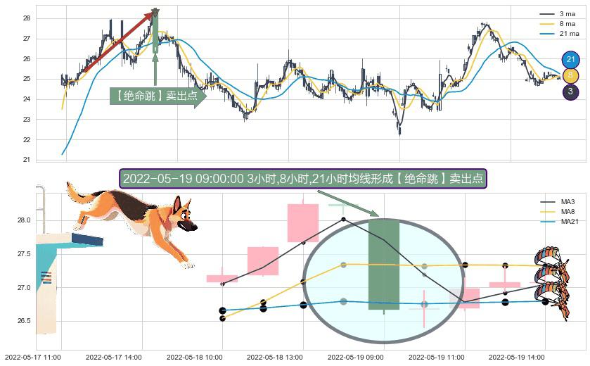 ⚀ 2022-05-19 09:00:00小时显现 3小时-8小时-21小时均线 【绝命跳】卖出点 看空信号,后市看跌,卖出