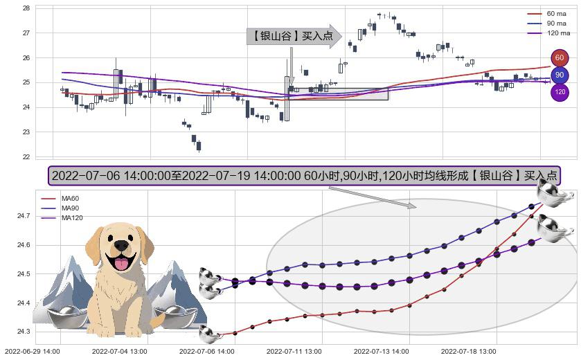 ⚀ 2022-07-07 13:00:00-小时至2022-07-19 14:00:00-小时显现 60小时-90小时-120小时均线 【银山谷】买入点 看多信号,后市看涨,买入