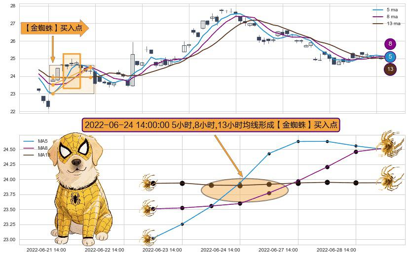 ⚀ 2022-06-24 14:00:00小时显现 5小时-8小时-13小时均线 【金蜘蛛】买入点 看多信号,后市看涨,买入