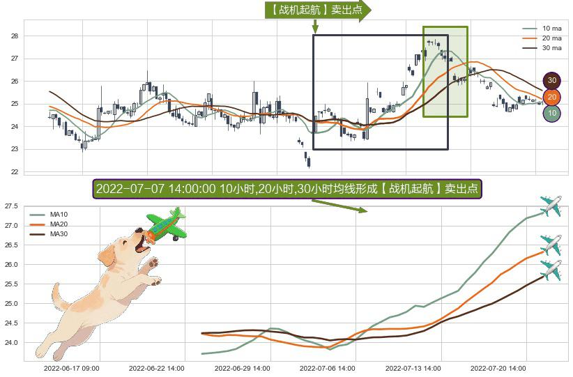 ⚀ 2022-06-23 14:00:00小时-2022-07-21 14:00:00小时显现 10小时-20小时-30小时均线 【战机起航】卖出点 看空信号,后市看跌,卖出