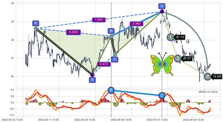 ➣ 已完成【蝴蝶】形态起点X: 04-28:10, 终点D: 06-27:13, 共175交易小时