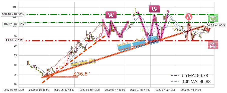 ♘ 阻力价格位102.21,可信任强度62.51%,距离最后交易2022-08-12 14:00形成的收盘价格96.52相差 +5.90%