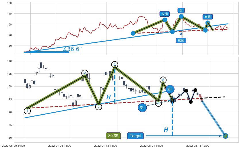 | 3 🅚:【断头铡刀】卖出点 ➕ 📐:头肩顶下行突破支撑位破位, 猜想持续下沉下跌,被突破的支撑位已变为阻力位 ☞ 看空信号 ⇥ 【均线】交织【图形】⇥ 综合量化分数: 36 | > |