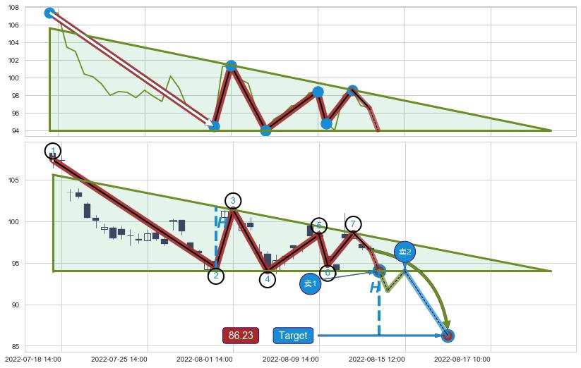 ➣ 最小中继整理跌幅→𝐇: 7.78 (下侧直角边第一支撑点②与斜边垂直距离)