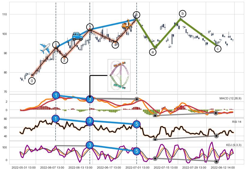 ➢ 1,3,5驱动浪MACD, RSI, KDJ走势都出现【常规背离】反转信号增强