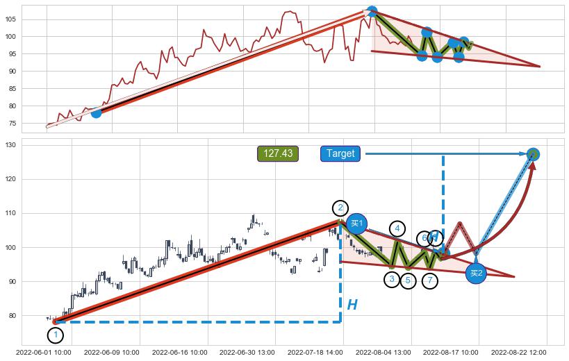 ➢ 最小中继整理涨幅→𝐇: 29.35 (𝐇楔型旗杆的长度:楔型起点→顶点)