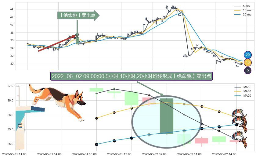 形态多维评估: ⚀ 2022-06-02 09:00:00小时显现 5小时-10小时-20小时均线 【绝命跳】卖出点 看空信号,后市看跌,卖出