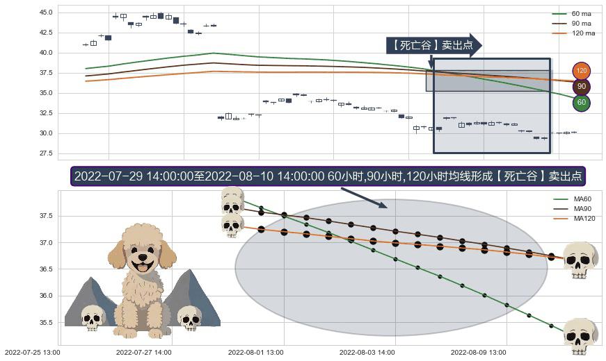 形态多维评估: ⚀ 2022-08-01 13:00:00-小时至2022-08-10 14:00:00-小时显现 60小时-90小时-120小时均线 【死亡谷】卖出点 看空信号,后市看跌,卖出