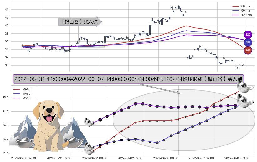 形态多维评估: ⚀ 2022-06-01 09:00:00-小时至2022-06-07 14:00:00-小时显现 60小时-90小时-120小时均线 【银山谷】买入点 看多信号,后市看涨,买入