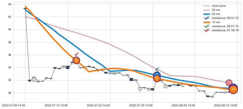 下跌趋势07-08 14:00-08-12 14:00,均线20, 15确认关键阻力2处
