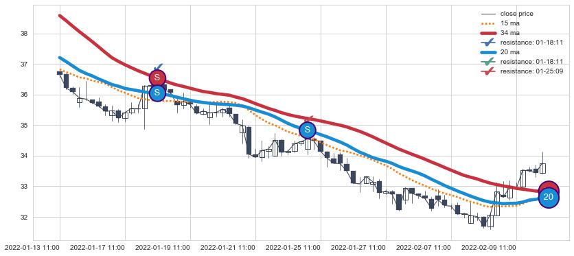 下跌趋势01-13 11:00-02-10 10:00,均线34, 20确认关键阻力2处