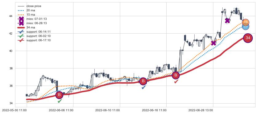 上涨趋势05-30 11:00-07-06 14:00,均线34确认关键支撑3处
