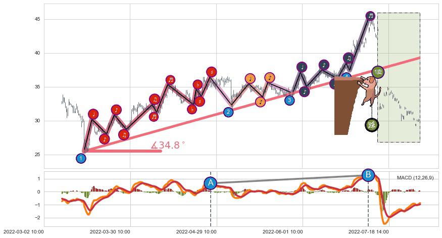 从2022-03-15 13:00至2022-05-05 10:00,共包含159个小时,阶段股价上涨36.94%,阶段股价变动位移路程比: 1 : 4,上涨趋势角度: 47.2