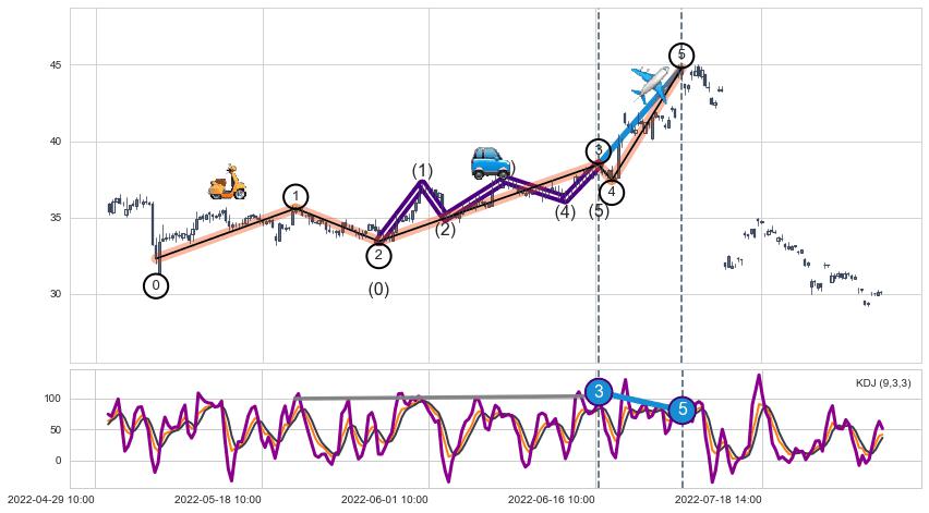 ➢ 第三,五驱动浪端点:【KDJ】走势出现【常规背离 & 反转信号】背离程度34.35%,背离夹角角度71.4˚,背离程度较小