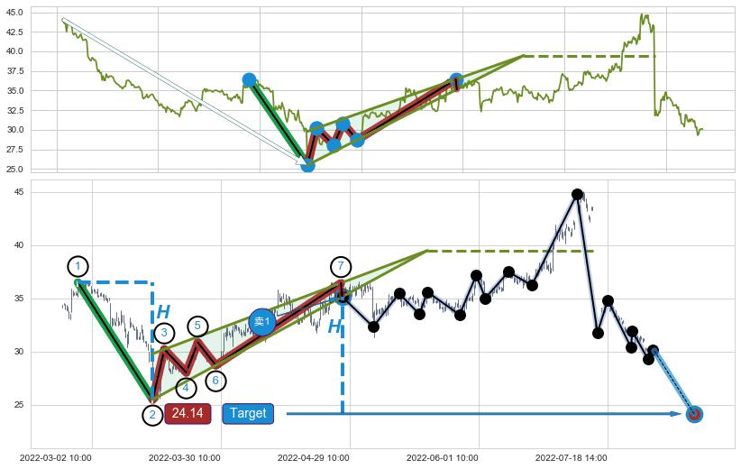 从2021-12-29 10:00至2022-02-08 11:00,共包含116个小时,阶段股价下跌-32.51%,阶段股价变动位移路程比: 1 : 2