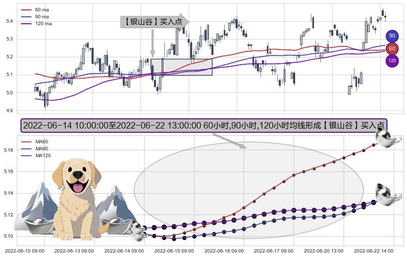 形态多维评估: ⚀ 2022-06-14 11:00:00-小时至2022-06-22 13:00:00-小时显现 60小时-90小时-120小时均线 【银山谷】买入点 看多信号,后市看涨,买入