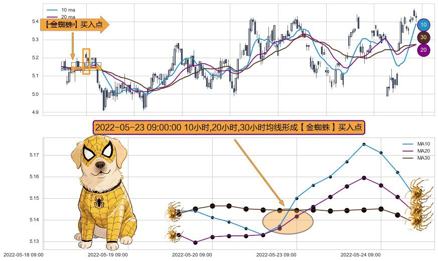 形态多维评估: ⚀ 2022-05-23 09:00:00小时显现 10小时-20小时-30小时均线 【金蜘蛛】买入点 看多信号,后市看涨,买入