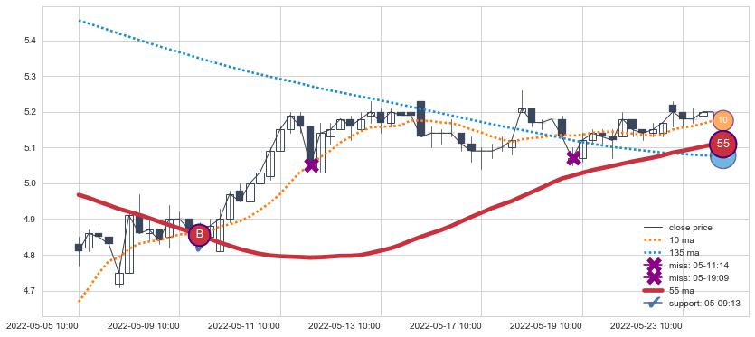 上涨趋势05-05 10:00-05-23 14:00,均线55确认关键支撑1处