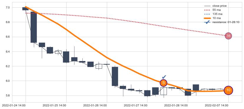 下跌趋势01-24 14:00-02-07 14:00,均线10确认关键阻力1处