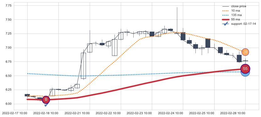 上涨趋势02-17 10:00-02-28 10:00,均线55确认关键支撑1处