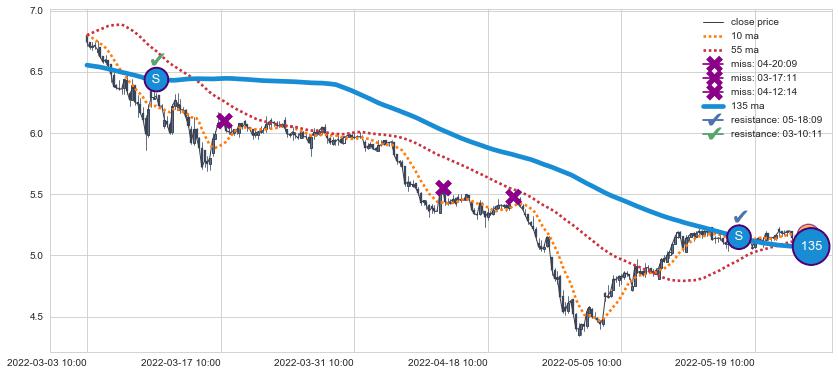 下跌趋势03-03 10:00-05-24 10:00,均线135确认关键阻力2处