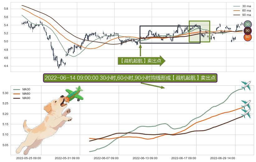 形态多维评估: ⚀ 2022-06-01 09:00:00小时-2022-07-01 14:00:00小时显现 30小时-60小时-90小时均线 【战机起航】卖出点 看空信号,后市看跌,卖出