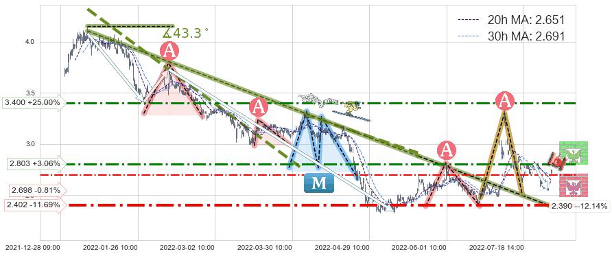 ⚔️ 2022-01-07 09:00-2022-05-20 14:00下跌趋势存在反转上涨[机会],其原下跌趋势的阻力位(2.390)已被突破[强支撑信号],原下跌趋势角度: 43.3˚