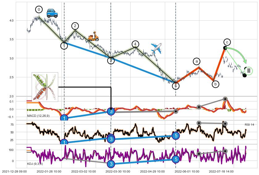 ➢ a,c调整浪MACD, RSI, KDJ走势都【未出现】背离,abc走势延续, 5浪反转概率增强