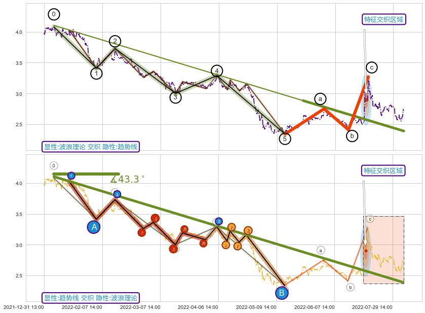 从2021-12-29 09:00至2022-01-27 14:00,共包含104个小时,阶段股价下跌-7.39%,阶段股价变动位移路程比: 1 : 10