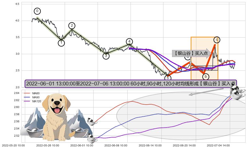 | 6 🅚:【银山谷】买入点 ➕ ☯️:缠论买卖点下降缠:猜想2买趋势延续,蓄力上涨至3买(大周期趋势均值回复中的小周期趋势跟踪) ☞ 看多信号 ⇥ 【均线】交织【图形】⇥ 综合量化分数: 59 | > |