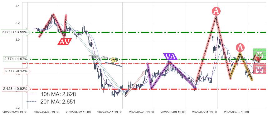 ♘ 阻力价格位2.774,可信任强度61.47%,距离最后交易2022-08-12 14:00形成的收盘价格2.720相差 +1.97%