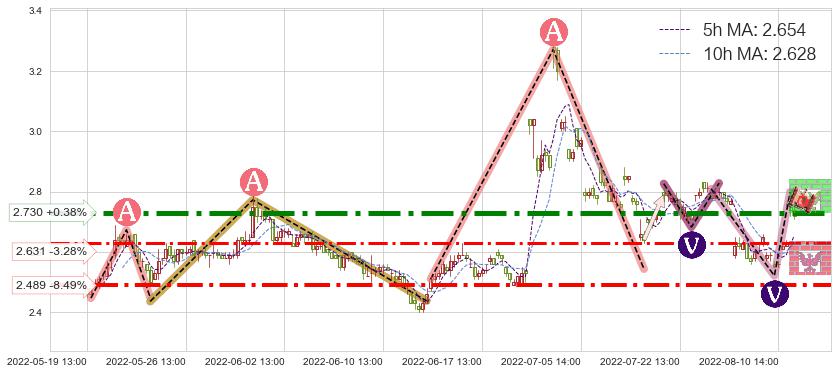 ♘ 阻力价格位2.730,可信任强度85.44%,距离最后交易2022-08-12 14:00形成的收盘价格2.720相差 +0.38%