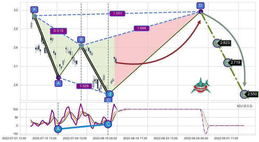 ➣ 未完成【鲨鱼】形态起点X: 07-05:14, 已到达C点: 08-10:13, 预测最终D点: 08-26:10, 共110交易小时