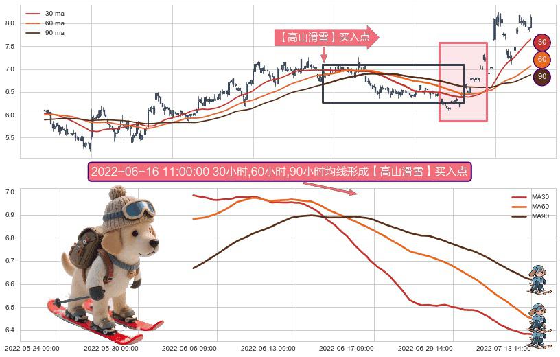 形态多维评估: ⚀ 2022-06-01 14:00:00小时-2022-07-13 14:00:00小时显现 30小时-60小时-90小时均线 【高山滑雪】买入点 看多信号,后市看涨,买入