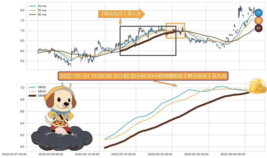 形态多维评估: ⚀ 2022-05-12 13:00:00小时-2022-06-07 09:00:00小时显现 20小时-30小时-60小时均线 【烘云托月】买入点 看多信号,后市看涨,买入