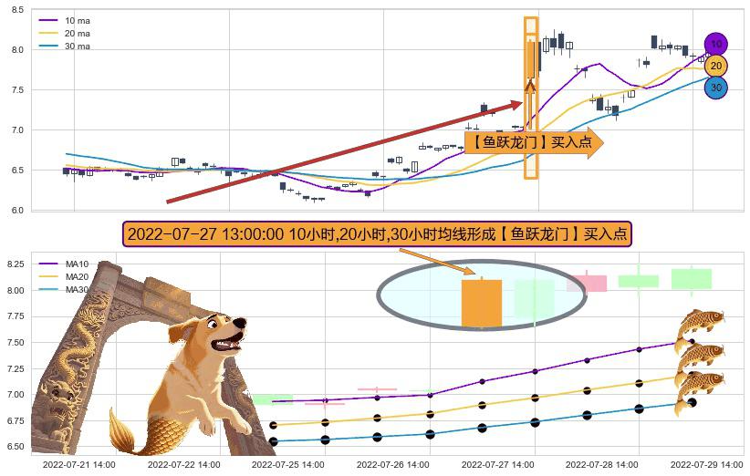 形态多维评估: ⚀ 2022-07-27 13:00:00小时显现 10小时-20小时-30小时均线 【鱼跃龙门】买入点 看多信号,后市看涨,买入