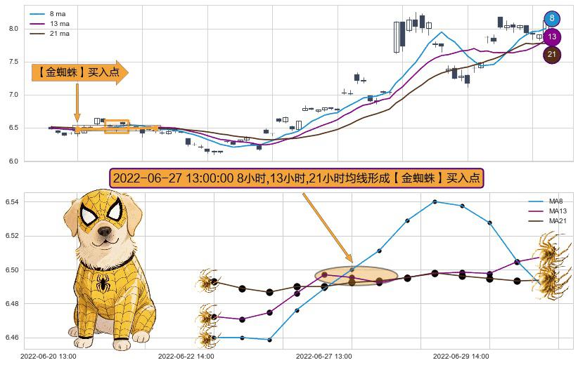 形态多维评估: ⚀ 2022-06-27 13:00:00小时显现 8小时-13小时-21小时均线 【金蜘蛛】买入点 看多信号,后市看涨,买入