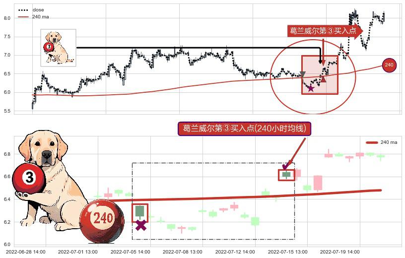 形态多维评估: ⚀ 2022-07-14 13:00:00-小时显现 葛兰威尔均线 240小时均线 第③买入点 上升趋势的中继信号,后市看涨,买进信号