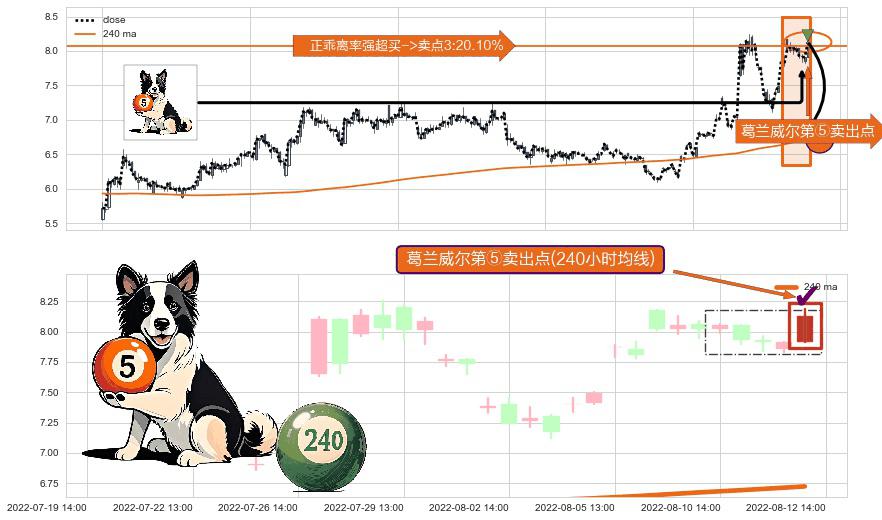 形态多维评估: ⚀ 2022-08-12 14:00:00-小时显现 葛兰威尔均线 240小时均线 第⑤卖出点 上升趋势均值回复的短线回落信号,后市看跌,卖出信号