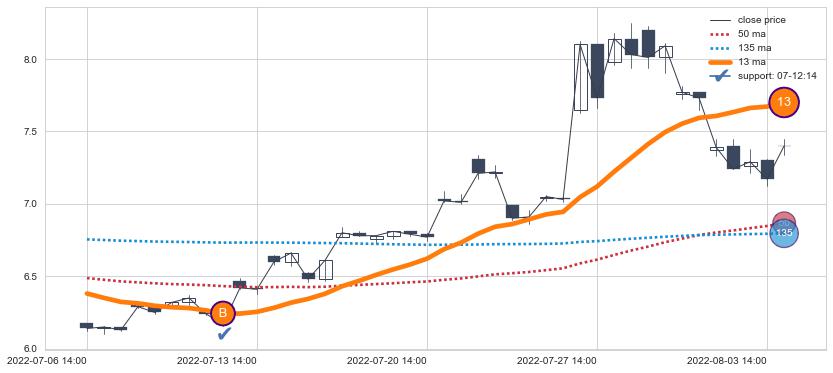 ⚂ 2022-07-05 13:00:00-小时均线向下破位,2022-07-14 13:00:00-小时重新上穿突破均线,均线支撑再次生效