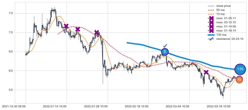 下跌趋势12-30 09:00-03-21 11:00,均线135确认关键阻力1处