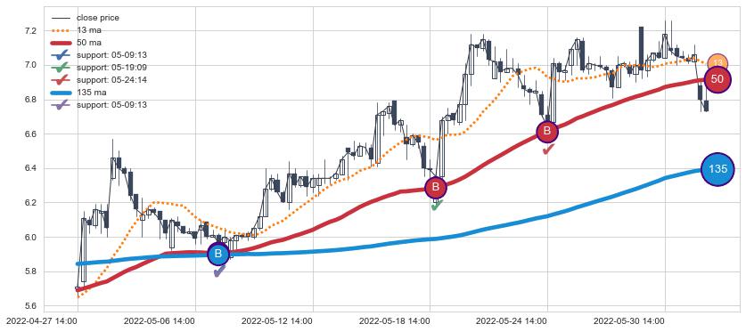 上涨趋势04-27 14:00-06-01 10:00,均线50, 135确认关键支撑3处