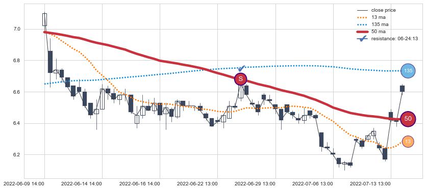下跌趋势06-09 14:00-07-14 13:00,均线50确认关键阻力1处