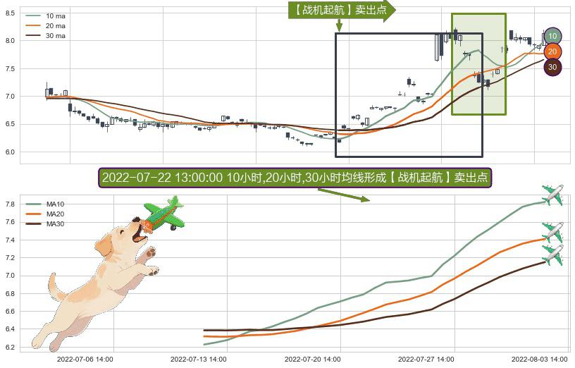形态多维评估: ⚀ 2022-07-12 14:00:00小时-2022-08-02 14:00:00小时显现 10小时-20小时-30小时均线 【战机起航】卖出点 看空信号,后市看跌,卖出