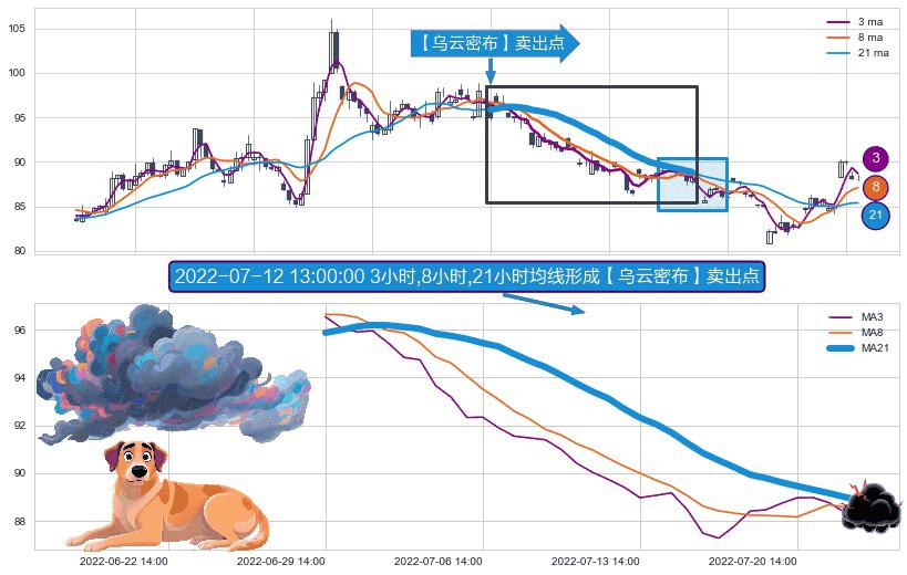 ⚀ 2022-06-29 14:00:00小时-2022-07-22 14:00:00小时显现 3小时-8小时-21小时均线 【乌云密布】卖出点 看空信号,后市看跌,卖出