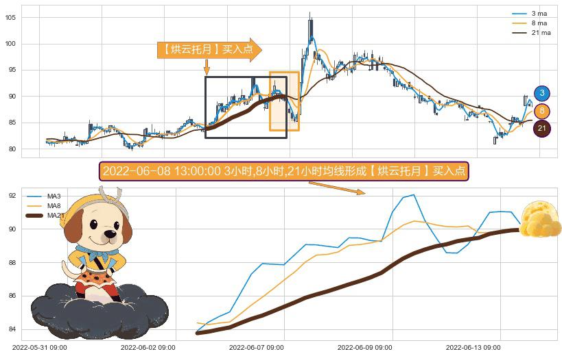 ⚀ 2022-06-02 11:00:00小时-2022-06-13 13:00:00小时显现 3小时-8小时-21小时均线 【烘云托月】买入点 看多信号,后市看涨,买入