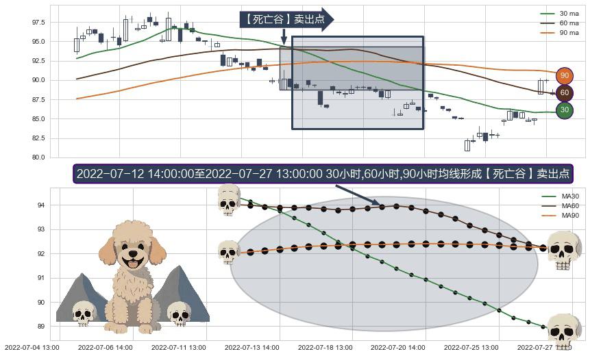 ⚀ 2022-07-13 13:00:00-小时至2022-07-27 13:00:00-小时显现 30小时-60小时-90小时均线 【死亡谷】卖出点 看空信号,后市看跌,卖出